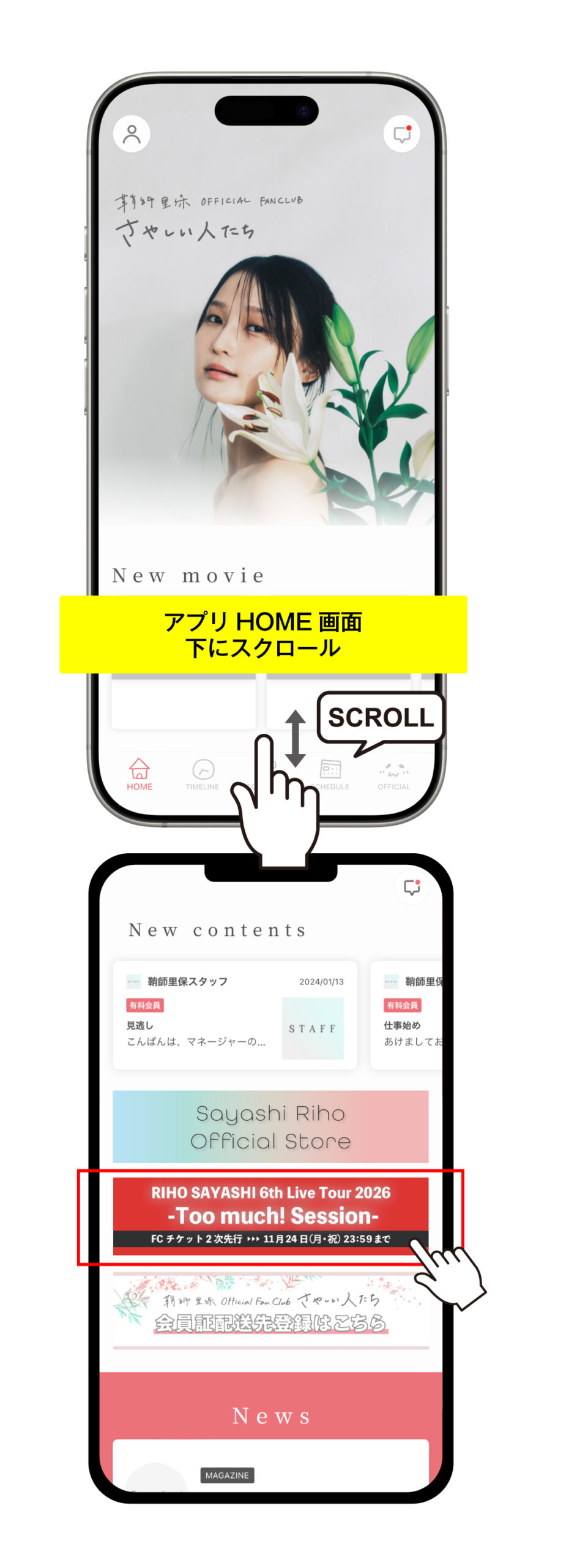 ★アプリHOME画面の「RIHO SAYASHI 6th Live Tour 2026」バナーからお進みいただきチケットをお申込みください。