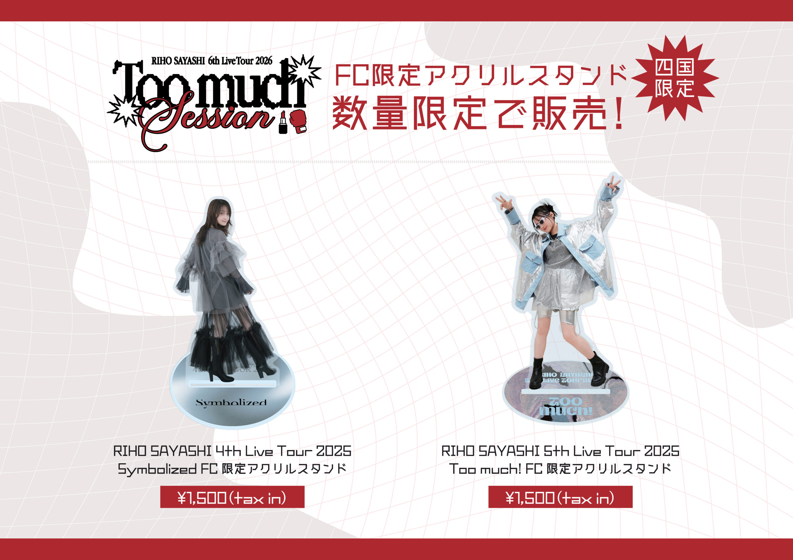 四国公演(高知・香川)会場物販限定で、Sayashi Riho Official Storeにて完売となっていた過去ツアーのFC限定アクスタを数量限定で販売することが決定いたしました!